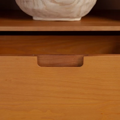Easily update your living space in a stylish, mid century modern fashion with this 70-inch TV stand from Saracina Home. Tapered legs, cutout drawer handles, and open shelving create a stylish and functional design for your living room, bedroom, home office, or kitchen. Made to showcase a beautiful, natural grain finish of stained, solid pine wood. Place your electronics on the open shelving, as it includes cord management features in back, and keep your media, accessories, books, and more in the three storage deep drawers. This 3-drawer TV stand functions as an entertainment center, storage cabinet, or buffet.